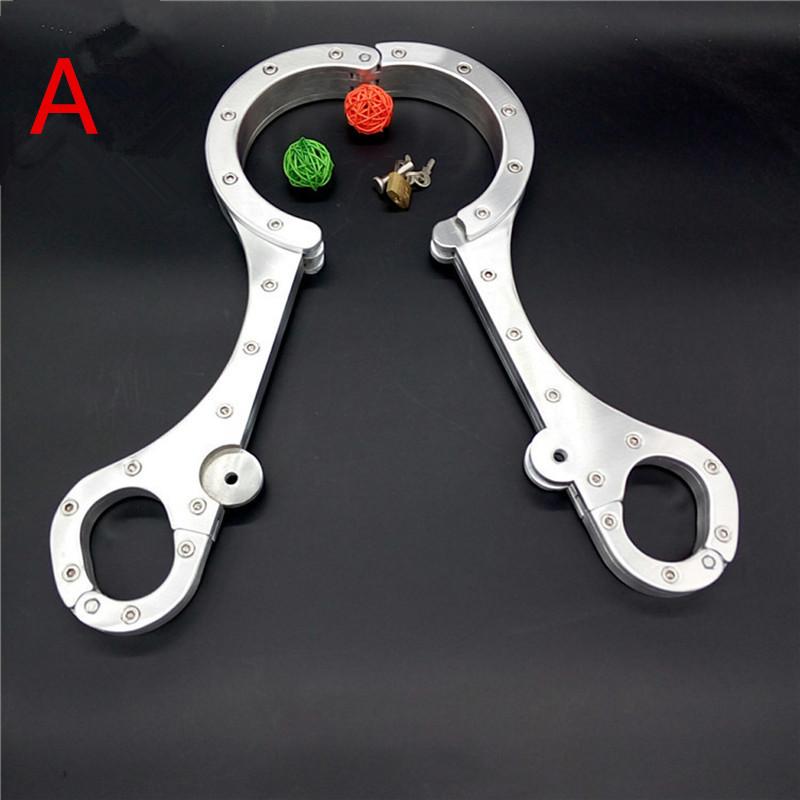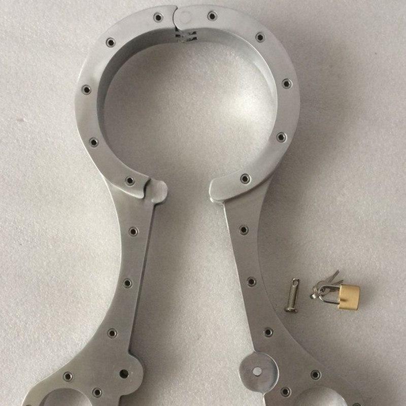 Description: Made for Dungeons and serious BDSM SM players, the Fiddle bondage restraints are made to look like the heavy ones used in the X-men film. This lockdown system is a memorably dramatic way to restrain your partner during your most intense BDSM sessions! Make an impact with a neat restraint that smoothly closes around their neck and wrists with a single simple trusty pin. Put the lock through the pin's hole and your partner will be rendered completely powerless, helpless to whatever torment you put them through. This heavy-duty piece of bondage equipment comes in tow sizes for smaller or bigger hands. The device provides neck-to-wrist restraints, with wrist cuffs in front & a collar in the middle. Firmly keeps the arms raised away from the body and immediately turns your sub into a helpless soul.
